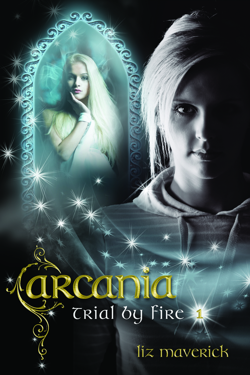 The Cover Story - Peri Poloni-Gabriel (Peri Poloni-Gabriel of Knockout Design has been in the business of designing |  Arcania: Trial by Fire, book 1 This cover was created strictly for e-book usage, with no spine or back cover. It is a young adult, dystopian novel with twin teens as the two main characters. Time/space travel, magical powers and the contrast in personalities between the twins were important concepts to convey. Using a dark background with stars, created not only the mystical feel, but also allowed the elements to visually tie together. I was able to find stock images that looked like the same model, but was, in actuality, two different young women. Being the first in a series, the type was created to have a branded feel with use of the filigree and metallic gold. |